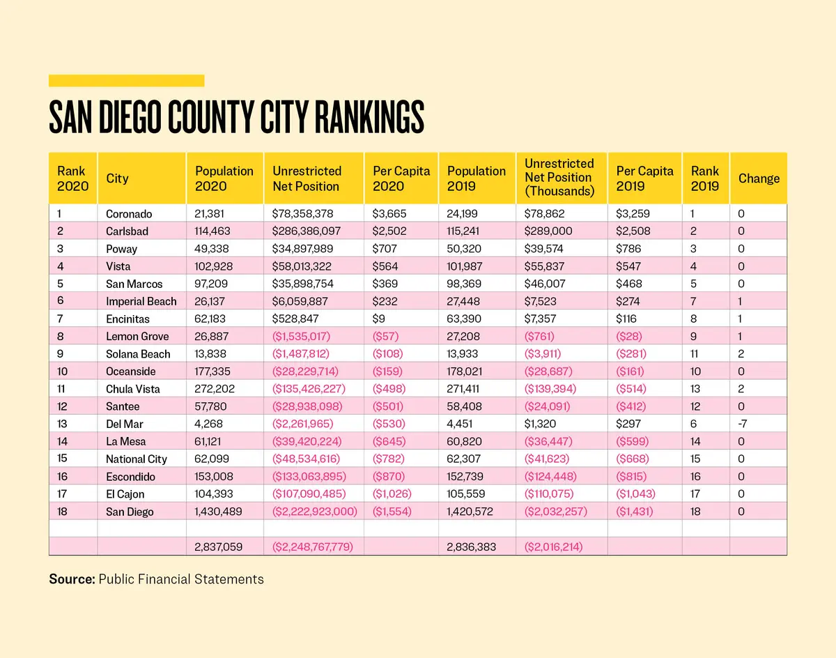 Chula Vista had a similar situation, with a slight reduction in its unrestricted net deficit combined with an increase in its population, allowing it to skip over the city of Santee and moved up two places.